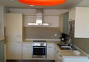 Open keuken met 4 kookplaten, magnetron, oven, eettafel, afwasmachine, koelkast en diepvriezer.