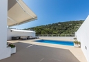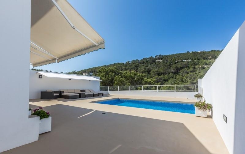 Villa met privé zwembad in Cala Vadella, op Ibiza, Spanje voor 6 personen. De accommodatie biedt een mooie tuin met gravel, een mooi zwembad en mooi uitzicht op de bergen.