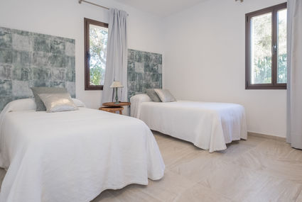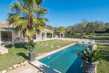 Ruberts 5 km from Sencelles: Very modern, beautiful farm estate "Can Nadal", built in 2017, surrounded by trees and fields. Outside the resort, 5.3 km from the centre of Sencelles, in the district Ruberts, in a quiet, sunny position, 27 km from the sea, 27 km from the beach, in the woods. Private: natural state property 15'000 m2 (fenced), large garden 700 m2 with lawn and trees, swimming pool angular (10 x 3 m, depth 140 cm, 01.01.-31.12.). Patio, arbour, pergola, garden furniture, barbecue. In the house: internet access, WiFi, air conditioning, washing machine. 50 m long gruff motor access to the house. Parking at the house on the premises. Shop 5 km, grocery 5 km, supermarket 5 km, restaurant 5 km, bar 5 km, 65 minute walk to the centre, bus stop 5 km, sandy beach "Playa de Can Pastilla" 27 m. Sports harbour 28 km, golf course 26 km. Please note: car recommended. Suitable for families, suitable for seniors. Object suitable for 6 adults + 1 child groups of teenagers on request only. Loading and unloading of baggage is possible at the holiday house. Animals in the neighbourhood. Airfield 29 km from the property.Beschikbaarheid