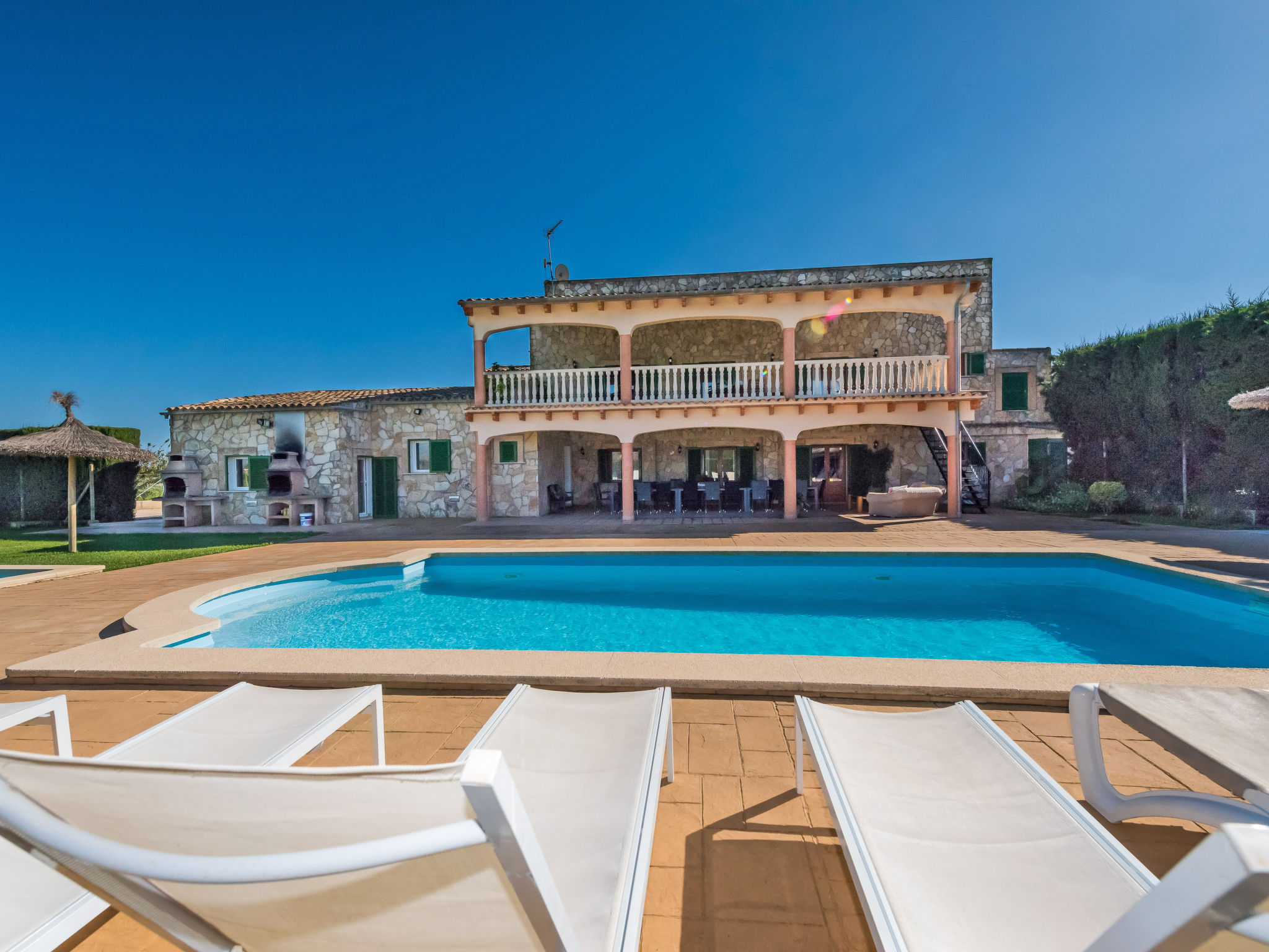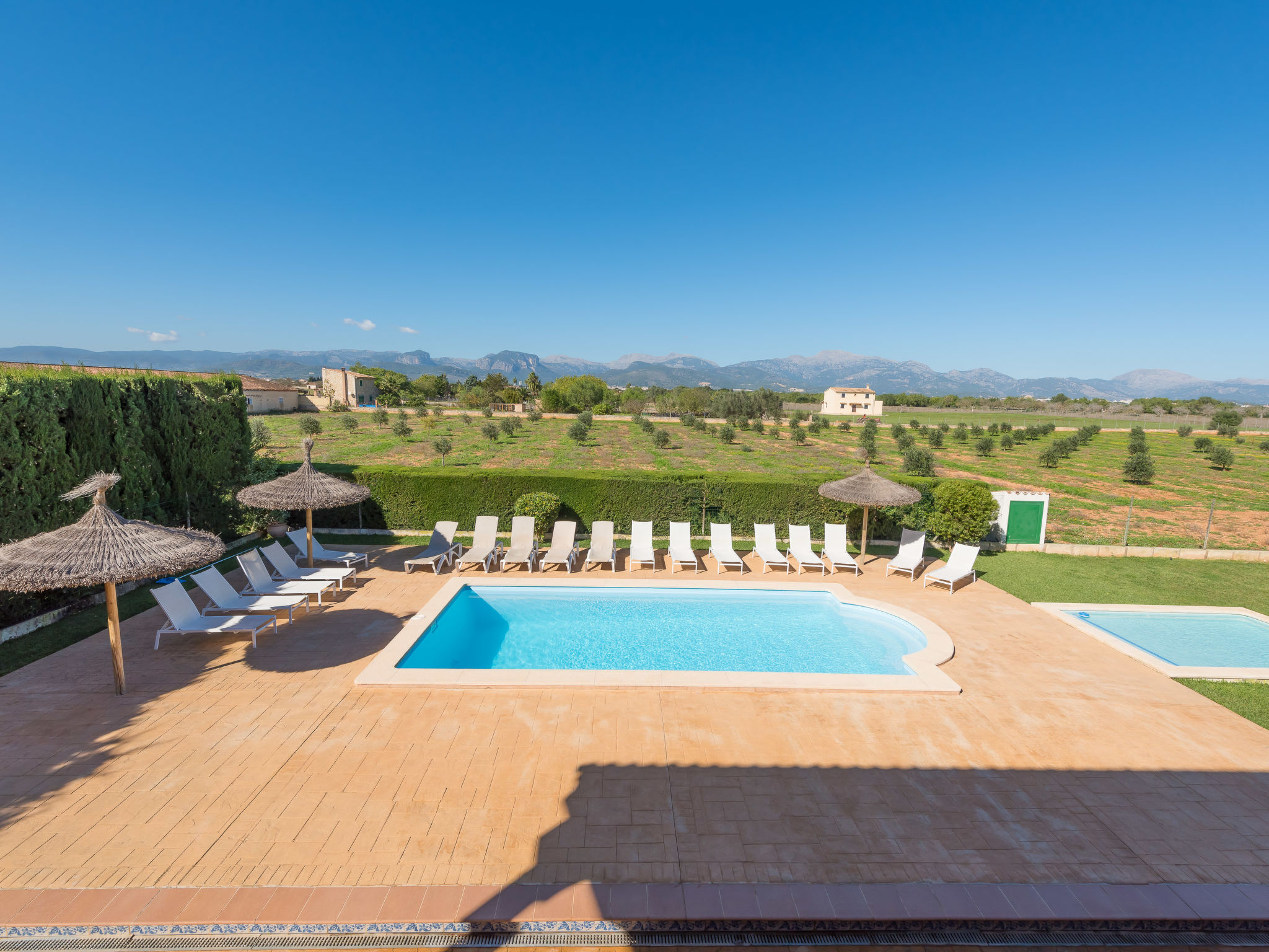 Sencelles: Very large, child friendly, beautiful villa "Solivelles gran -24 Guests.", 2 storeys, renovated, surrounded by trees, fields and vineyards. Outside the resort, in a secluded, quiet, sunny position, area with little traffic, 3 km from the edge of the forest, 30 km from the sea, 30 km from the beach. Private: natural state property, garden with lawn, swimming pool angular (8 x 4 m, 01.01.-31.12.). Paddling pool, outdoor shower, patio, pergola, garden furniture, barbecue (swing). In the house: WiFi, storage room for bicycles, air conditioning, washing machine, tumble dryer. Parking (for 10 cars) at the house. Shop 3 km, grocery 3 km, supermarket 3 km, shopping centre 30 km, restaurant 3 km, bar 3 km, bakery 3 km, café 3 km, pub garden 3 km, bus stop 4 km, railway station 4 km, sandy beach 30 km pebble beach 30 km, shingle beach 30 km, rocky beach 30 km. Sports harbour 30 km, marina 30 km, golf course (18 hole) 30 km, surf school 30 km, sailing school 30 km, tennis 3 km, riding stable 4 km, sports centre 4 km. Please note: suitable for families, suitable for seniors. Object suitable for 24 adults. Loading and unloading of baggage is possible at the holiday house. From November to February is permited to book for 3 nights, check with Interhome. Option 18 Guests: Reference ES8346.104.1 Option for 32 Guests: Referencia ES8346.109.1.Beschikbaarheid